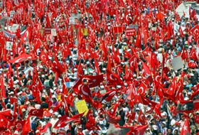 Los manifestantes se reunieron el domingo en la plaza central de Samsun y gritaron "¡Turquía laica, para hoy y para siempre!", mientras agitaban banderas rojas y levantaban carteles con la imagen de Ataturk. Los organizadores dijeron que la participación sería menor que en otras protestas anteriores. Un fotógrafo de la AP estimó que había cerca de 20.000 personas. La semana pasada, más de un millón de personas manifestó contra el gobierno en la ciudad de Izmir.